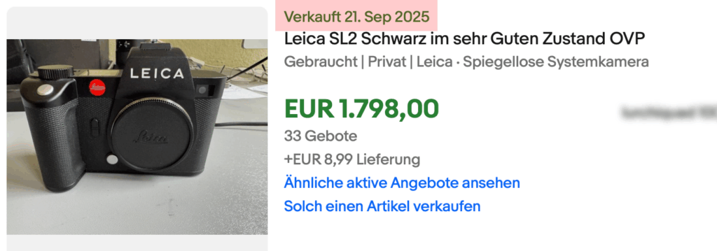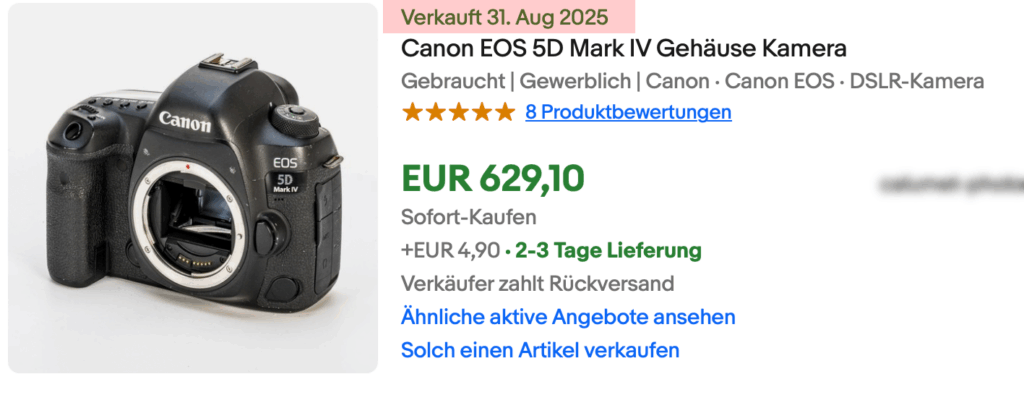 Um einen realistischen Eindruck zu bekommen zu welchen Preisen Kameras und Objektive tatsächlich auf dem Gebrauchtmarkt weg gehen und wo der aktuelle Wert liegt, schau dir auf Ebay die Kategorie Verkauft/Abgeschlossene Angebote an.