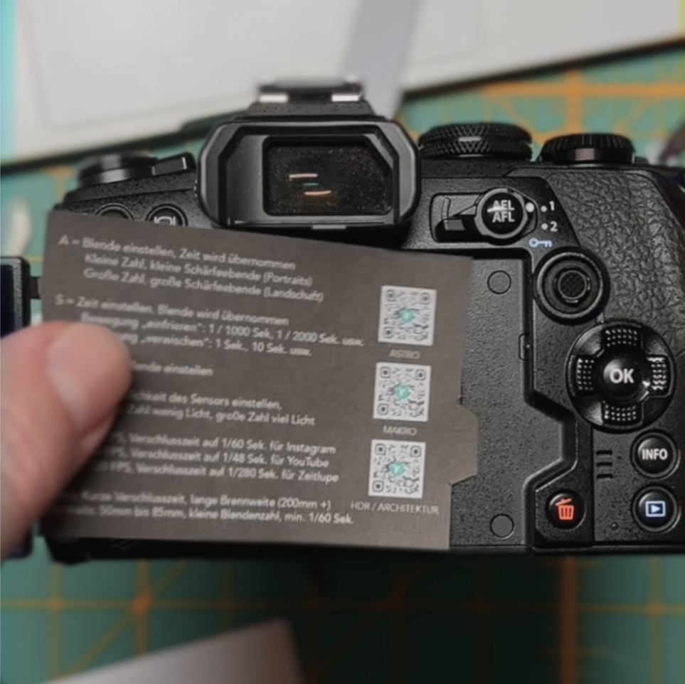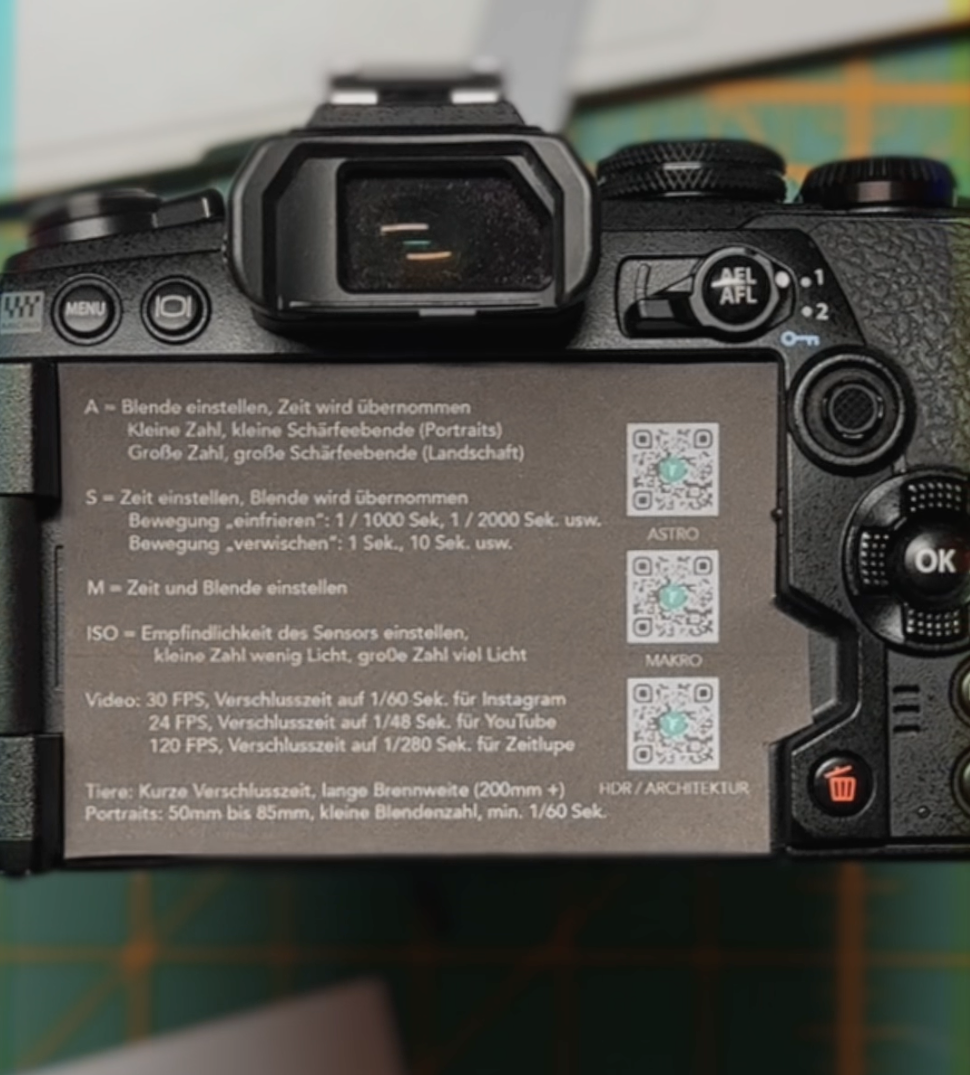 Der Kamera-Spicker ist ein Hilfsmittel mit dem du ganz einfach einen kleinen Spickzettel zu deinem Modell dabei hast. Du klebst ihn einfach in den Bereich in welchem du das Klappdisplay versenkst. Er ist auf passendem wieder lösbaren Sticker Material gedruckt. Einiges steht direkt drauf, anderes kannst du über den QR Code abrufen.